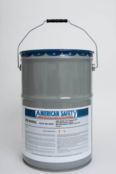 MS-8000L is a low temperature, fast cure, high solid, heavy duty non-skid deck coating formulated with special epoxy resins and aggregates to give maximum adhesion on Aircraft Carrier flight deck landing areas. Providing non-skid protection for aircraft, rolling equipment, and personnel, its ultra-high solids formulation is more environmentally friendly and reduces reporting requirements under NESHAP rules.Fire retardant in the cured state, MS-8000L is resistant to fire and jet blast, most acids, alkali’s, solvents, grease, oil, salt water, detergents, alcohol, gasoline, jet fuels, cellulube and other hydraulic fluids. Because of its tenacious bond, rust will not creep under the coating if fractured.In accordance with NAVSEA guidance to non-skid systems, MS-8000L is designed to be used in conjunction with the following American Safety Technologies MIL-SPEC and NAVSEA approved products: MS-11CZ Primer and MS-200/ MS-201 Color Topping.